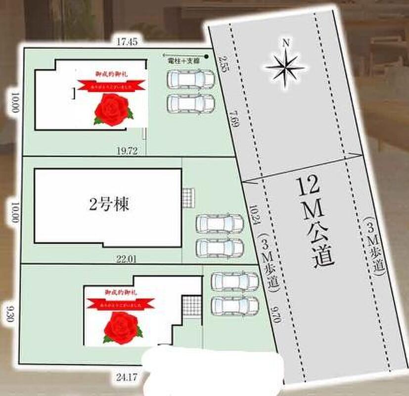 | 駐車場 | 2台 ~ 3台 | 道路の幅員 | 道路幅:12m、コンクリート舗装 |