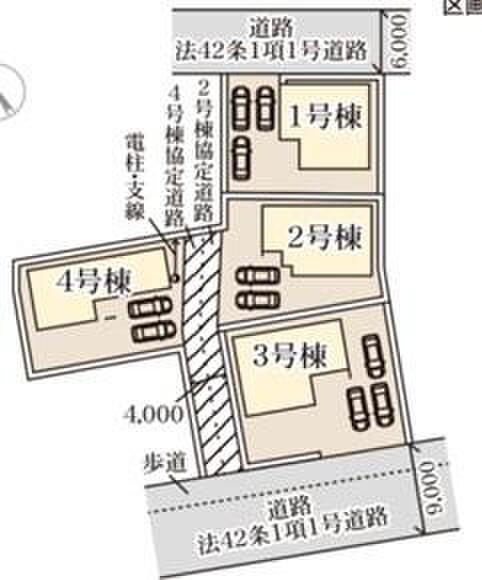 | 駐車場 | 2台 ~ 3台(2・4号棟(2台)、1・3号棟(3台)) | 道路の幅員 | 道路幅:6m~9m、アスファルト舗装 |