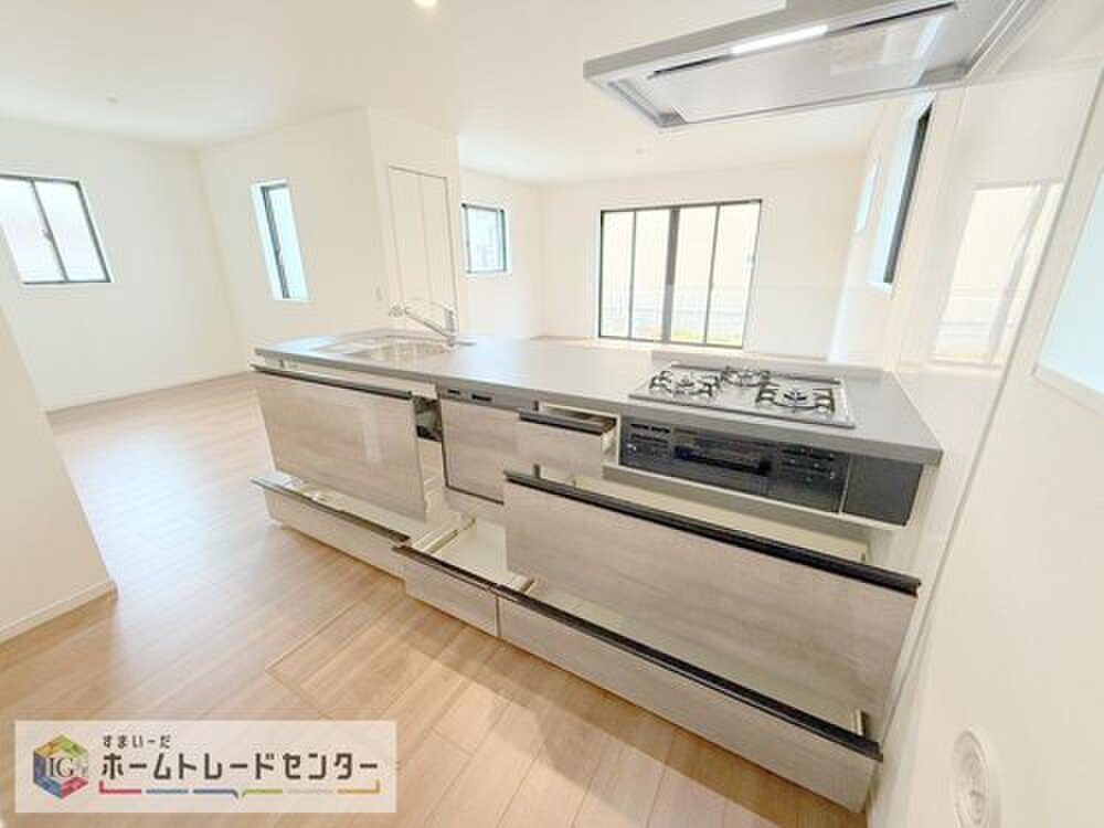 人気の対面式キッチン☆お食事の準備をしながらでもご家族とのコミュニケーションを楽しめます♪スライドタイプの収納を採用してますので、奥までしっかりと収納空間を利用できます。取り出しも簡単に♪