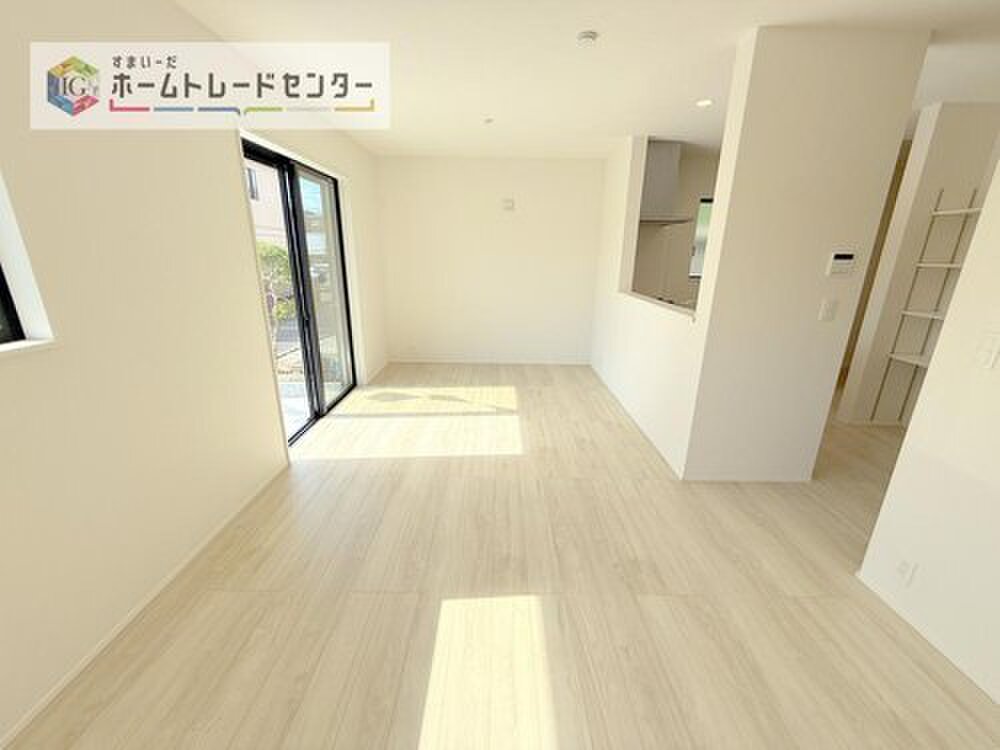 キッチンからリビングの視界です。家事をしていてもしっかりご家族とコミュニケーションをお取りいただけます。お片付けの当番になった方もこれでしっかりと話題の中に入っていけます。
