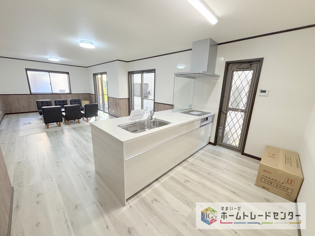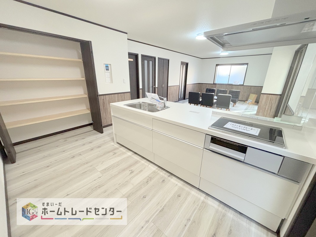 キッチンからリビングへの視界、動線です。対面キッチンですので、常にご家族が視界に入るのはもちろん、動線を広めにとっておりますので、お料理やお皿を持ちながらすれ違ってもぶつかる心配がありません。
