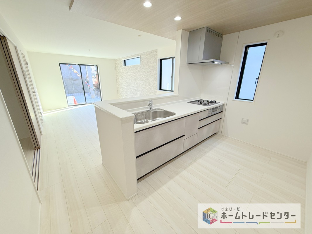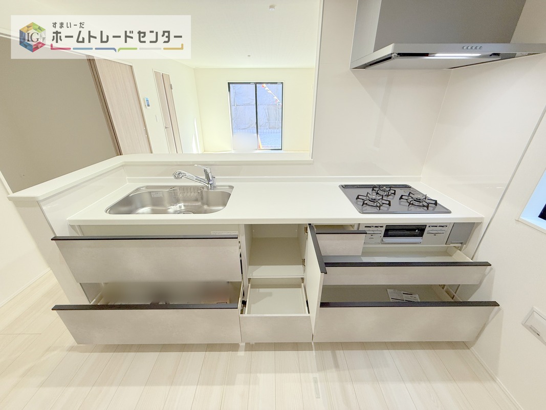 人気の対面式キッチン☆お食事の準備をしながらでもご家族とのコミュニケーションを楽しめます♪スライドタイプの収納を採用してますので、奥までしっかりと収納空間を利用できます。取り出しも簡単に♪