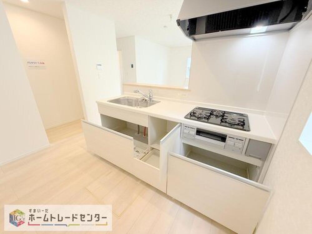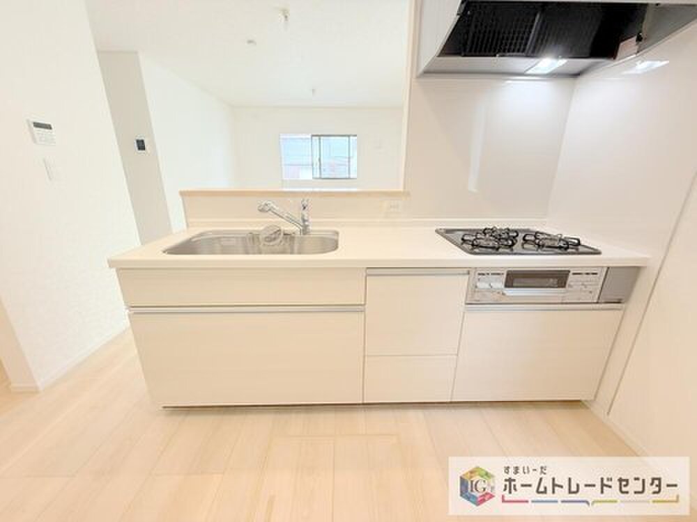 キッチンからリビングへの視界、動線です。対面キッチンですので、常にご家族が視界に入るのはもちろん、動線を広めにとっておりますので、お料理やお皿を持ちながらすれ違ってもぶつかる心配がありません。