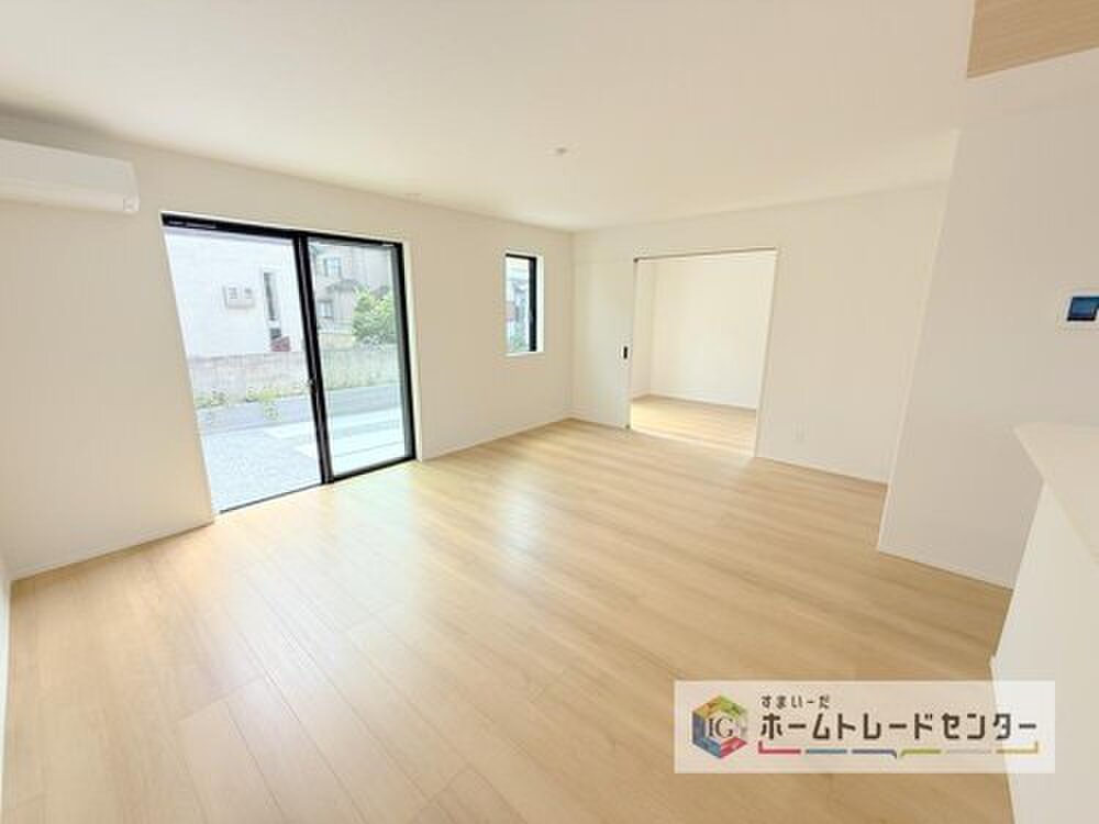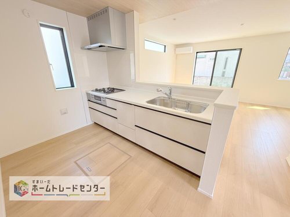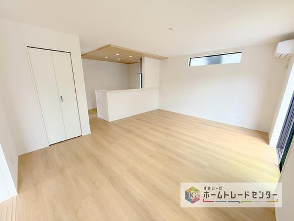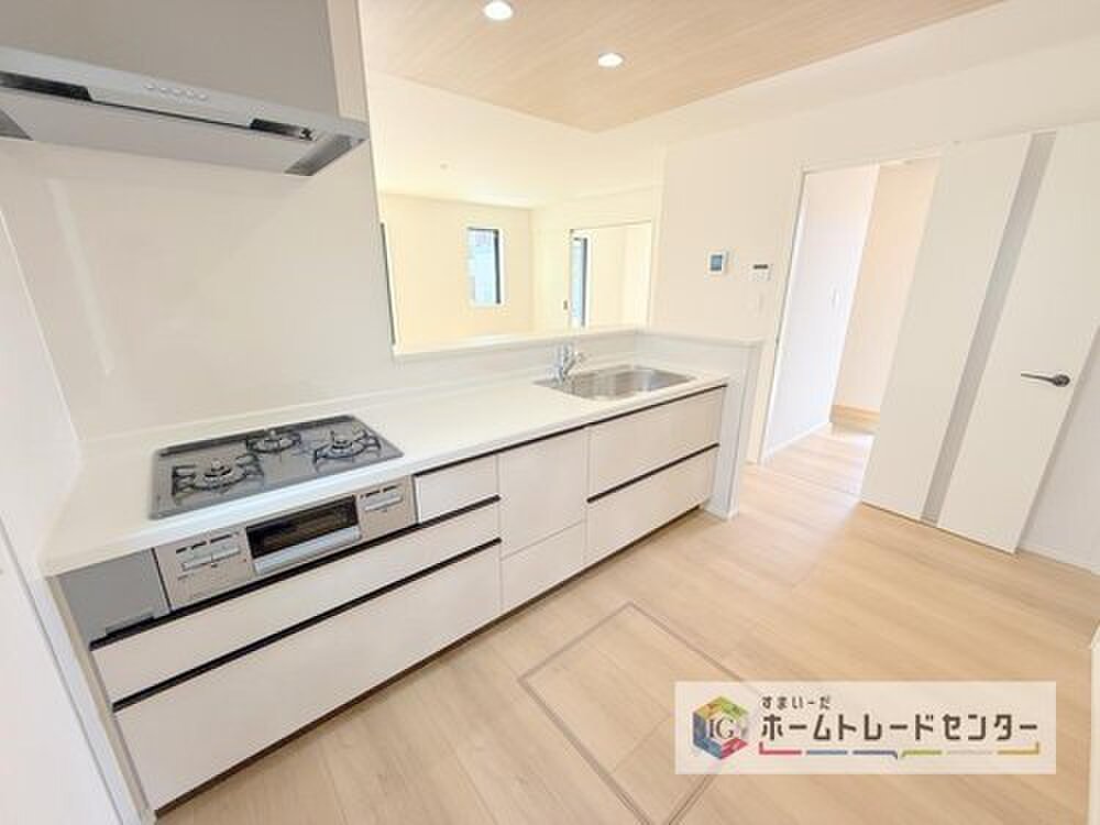 キッチンからリビングへの視界、動線です。対面キッチンですので、常にご家族が視界に入るのはもちろん、動線を広めにとっておりますので、お料理やお皿を持ちながらすれ違ってもぶつかる心配がありません。