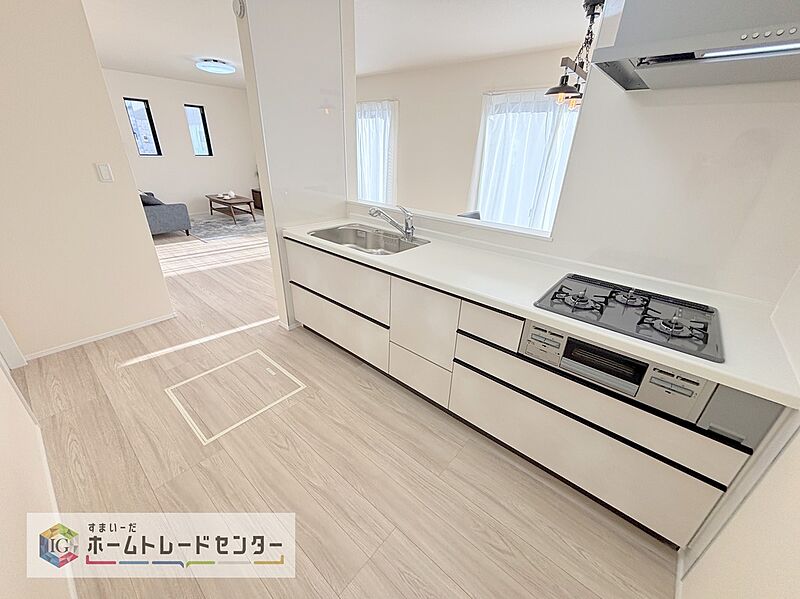 人気の対面式キッチン☆お食事の準備をしながらでもご家族とのコミュニケーションを楽しめます♪スライドタイプの収納を採用してますので、奥までしっかりと収納空間を利用できます。取り出しも簡単に♪