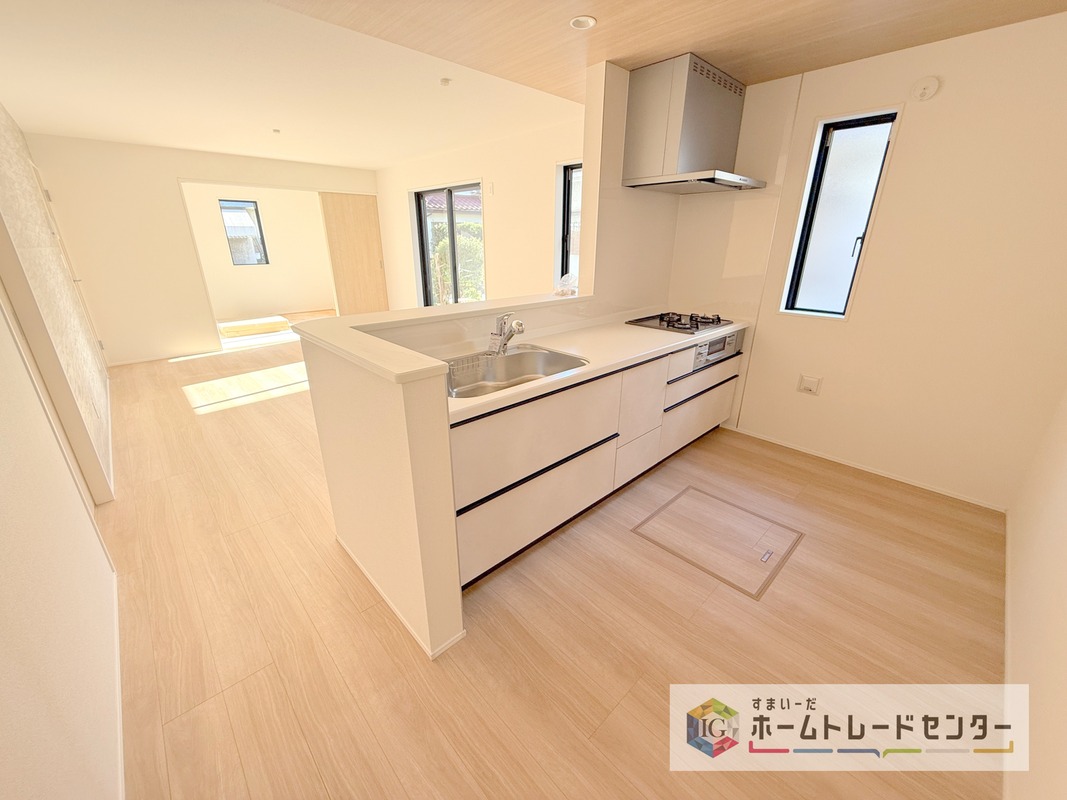 キッチンからリビングへの視界、動線です。対面キッチンですので、常にご家族が視界に入るのはもちろん、動線を広めにとっておりますので、お料理やお皿を持ちながらすれ違ってもぶつかる心配がありません。