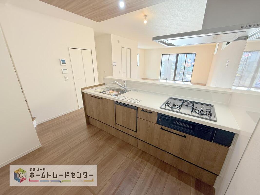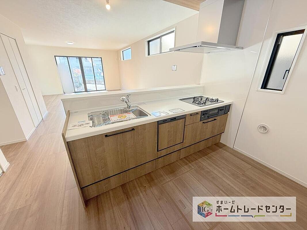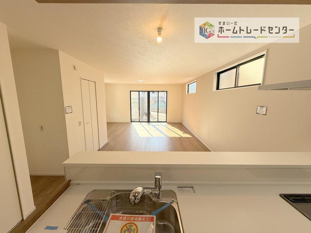 キッチンからリビングの視界です。家事をしていてもしっかりご家族とコミュニケーションをお取りいただけます。お片付けの当番になった方もこれでしっかりと話題の中に入っていけます。