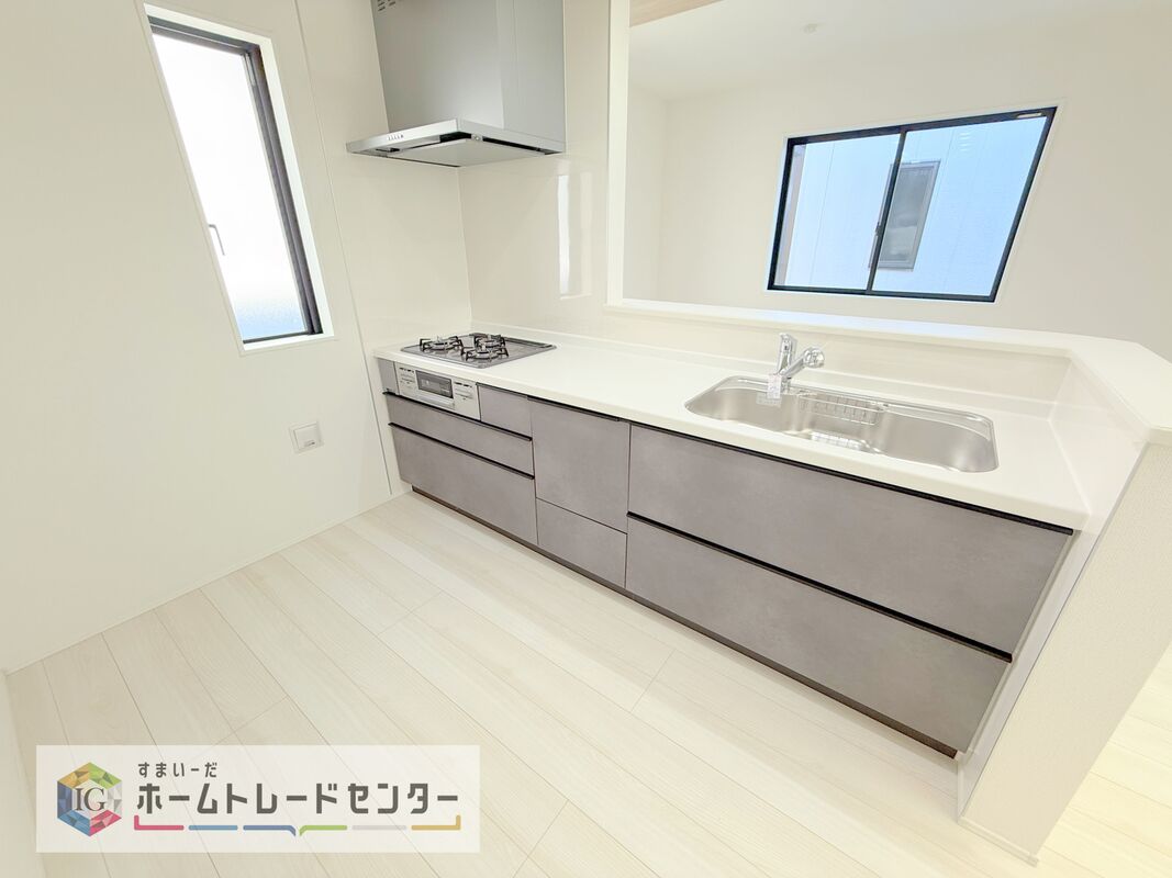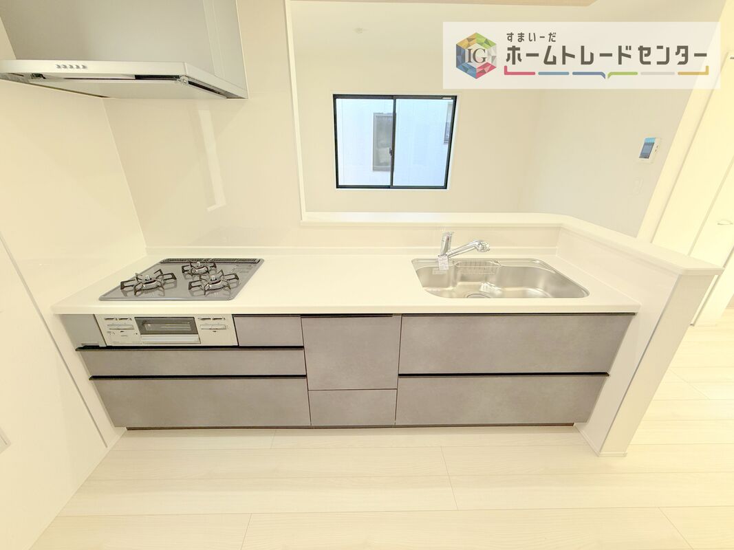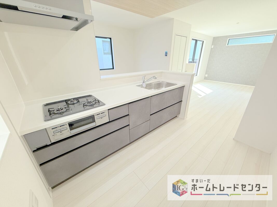 人気の対面式キッチン☆お食事の準備をしながらでもご家族とのコミュニケーションを楽しめます♪スライドタイプの収納を採用してますので、奥までしっかりと収納空間を利用できます。取り出しも簡単に♪