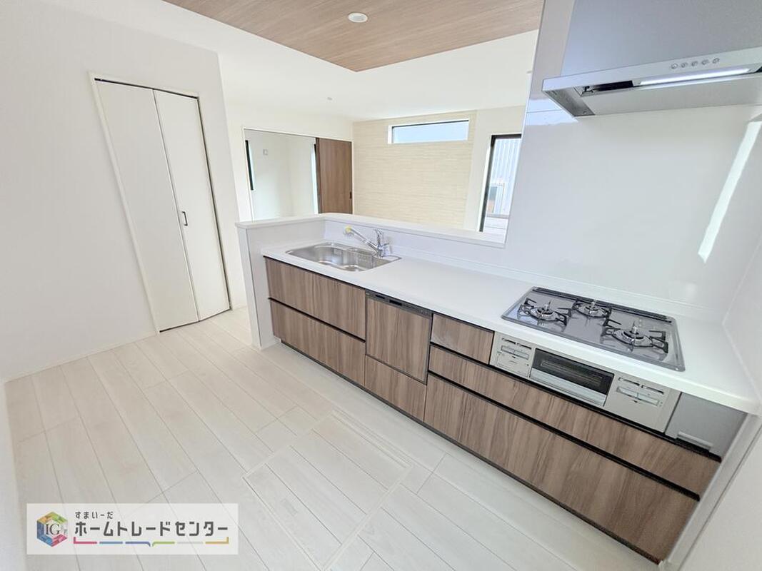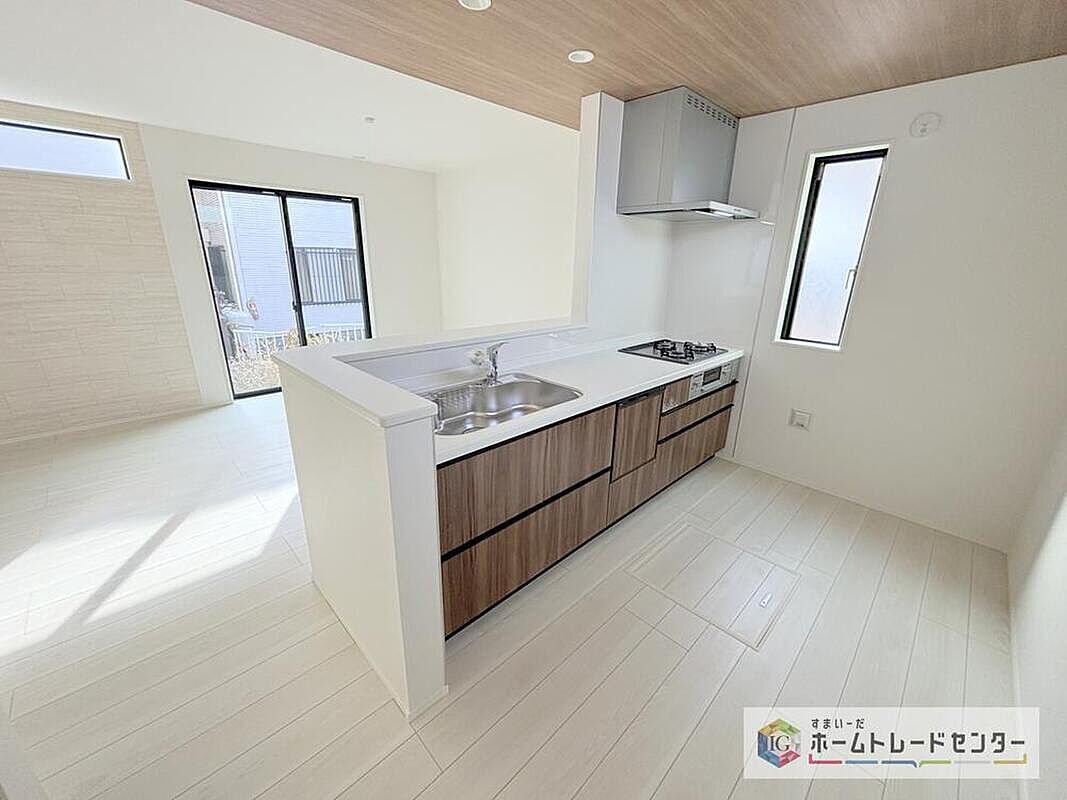 人気の対面式キッチン☆お食事の準備をしながらでもご家族とのコミュニケーションを楽しめます♪スライドタイプの収納を採用してますので、奥までしっかりと収納空間を利用できます。取り出しも簡単に♪