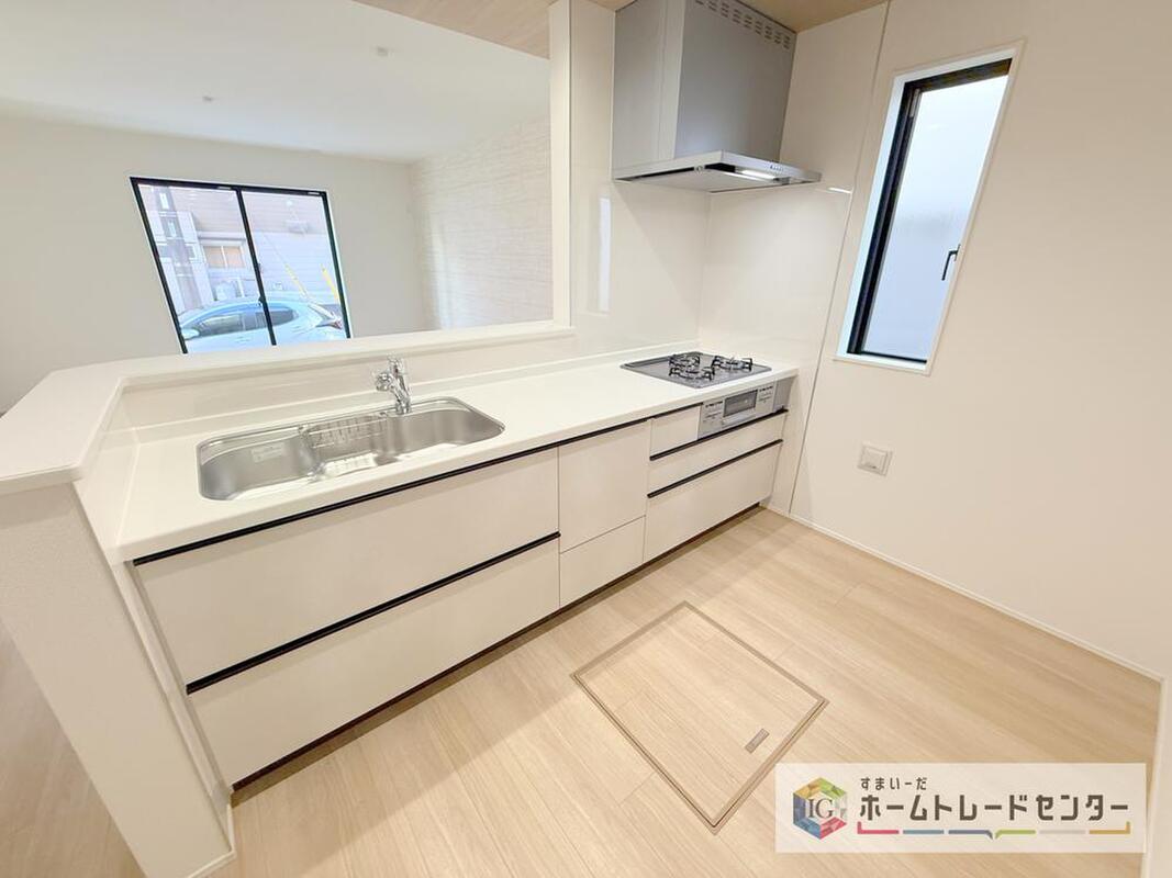 リビング全体が見渡せる対面キッチン。お子様を見守りながらお料理をしたり、家族と談笑しながら家事ができます。また、対面でカウンターが設置されているため、バーカウンターのような空間も作ることができます。