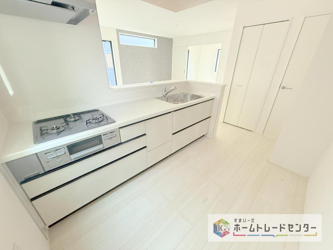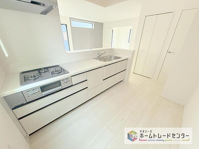 人気の対面式キッチン☆お食事の準備をしながらでもご家族とのコミュニケーションを楽しめます♪スライドタイプの収納を採用してますので、奥までしっかりと収納空間を利用できます。取り出しも簡単に♪
