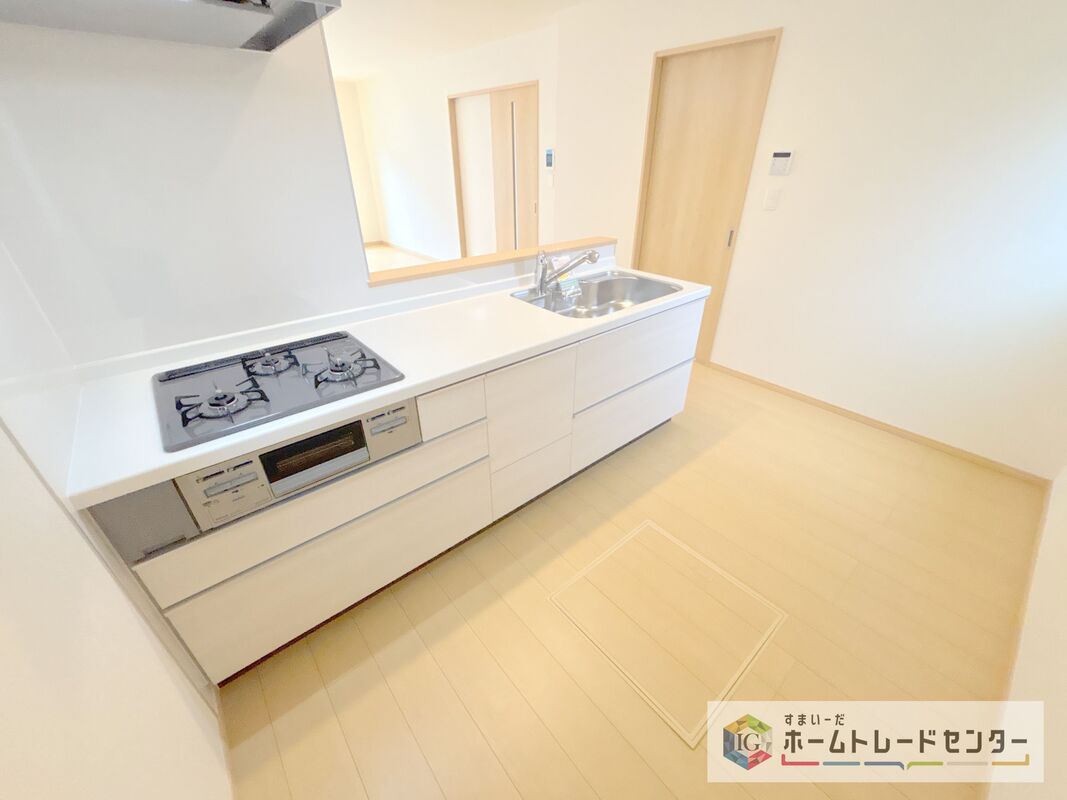 人気の対面式キッチン☆お食事の準備をしながらでもご家族とのコミュニケーションを楽しめます♪スライドタイプの収納を採用してますので、奥までしっかりと収納空間を利用できます。取り出しも簡単に♪
