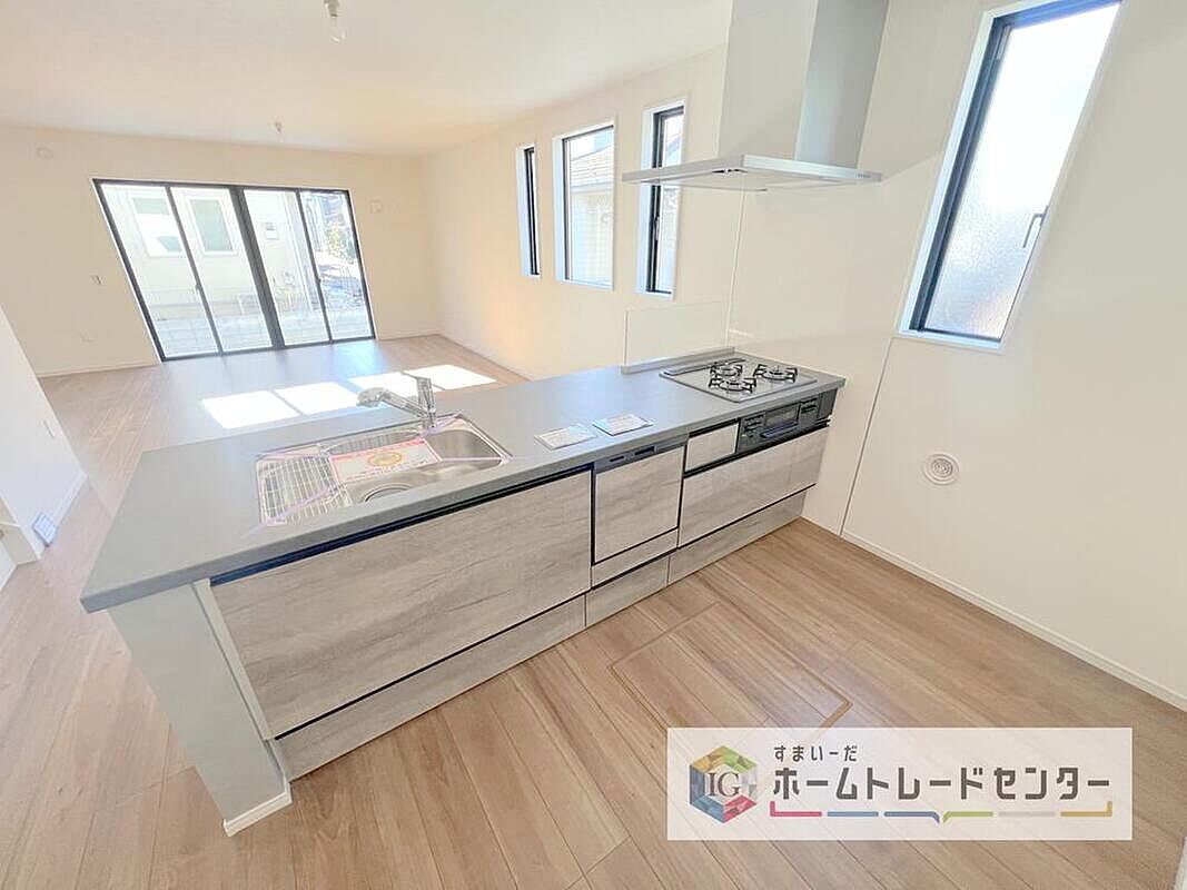 人気の対面式キッチン☆お食事の準備をしながらでもご家族とのコミュニケーションを楽しめます♪スライドタイプの収納を採用してますので、奥までしっかりと収納空間を利用できます。取り出しも簡単に♪