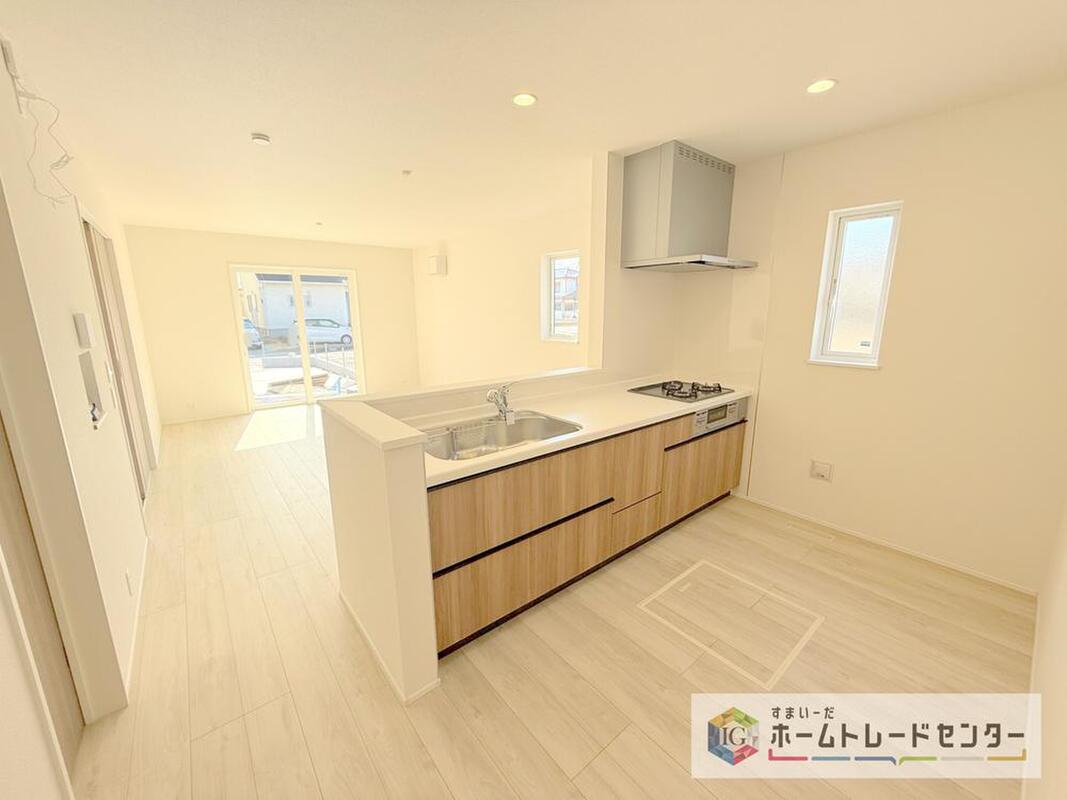 ■キッチンからリビングの視界です。家事をしていてもしっかりご家族とコミュニケーションをお取りいただけます。お片付けの当番になった方もこれでしっかりと話題の中に入っていけます。