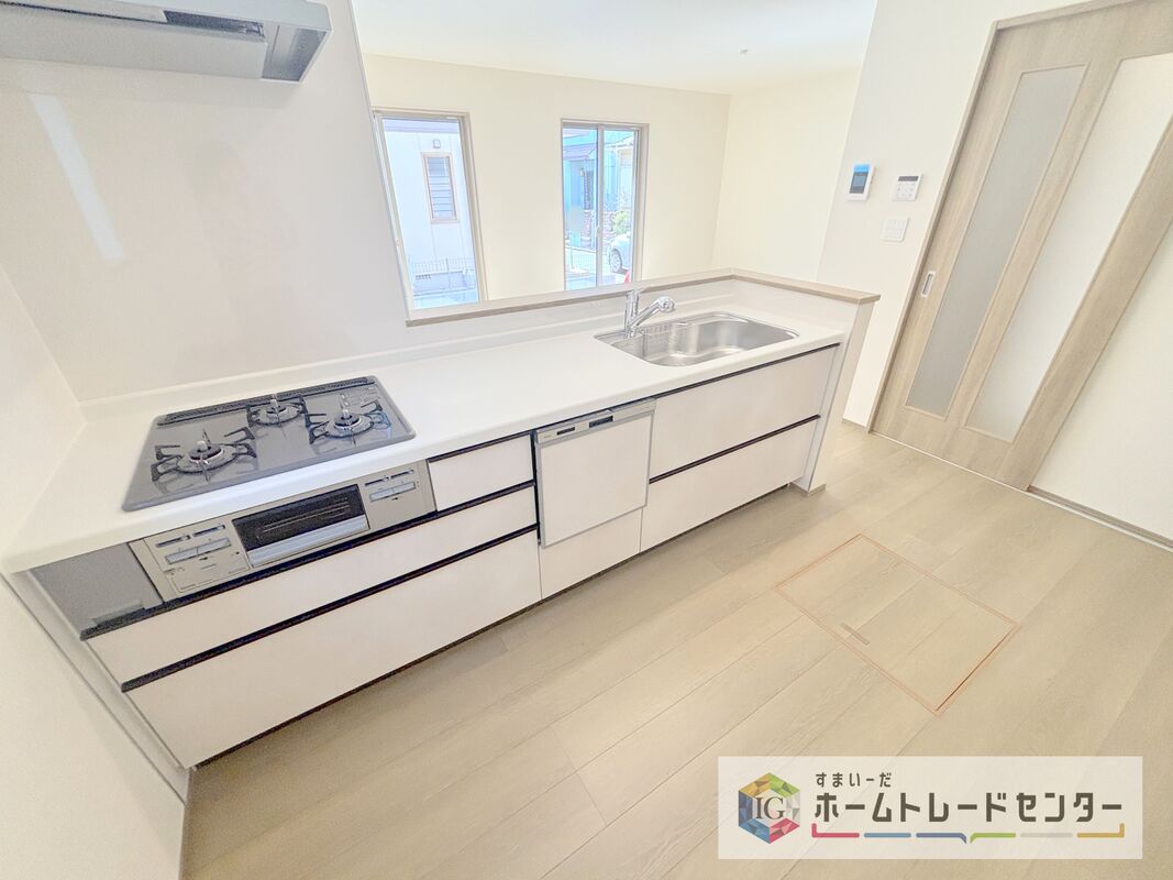 人気の対面式キッチン☆お食事の準備をしながらでもご家族とのコミュニケーションを楽しめます♪スライドタイプの収納を採用してますので、奥までしっかりと収納空間を利用できます。取り出しも簡単に♪