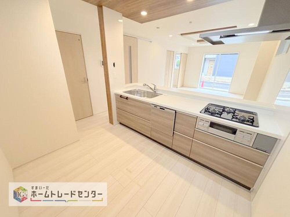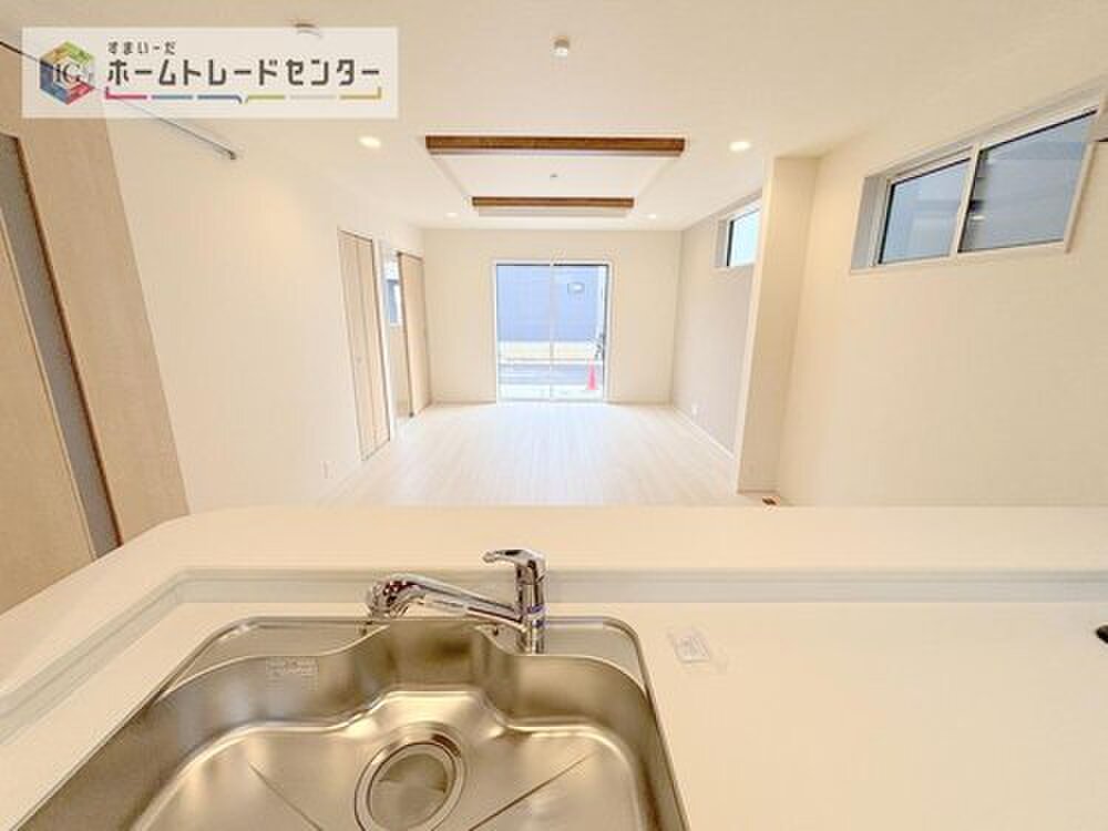 キッチンからリビングの視界です。家事をしていてもしっかりご家族とコミュニケーションをお取りいただけます。お片付けの当番になった方もこれでしっかりと話題の中に入っていけます。