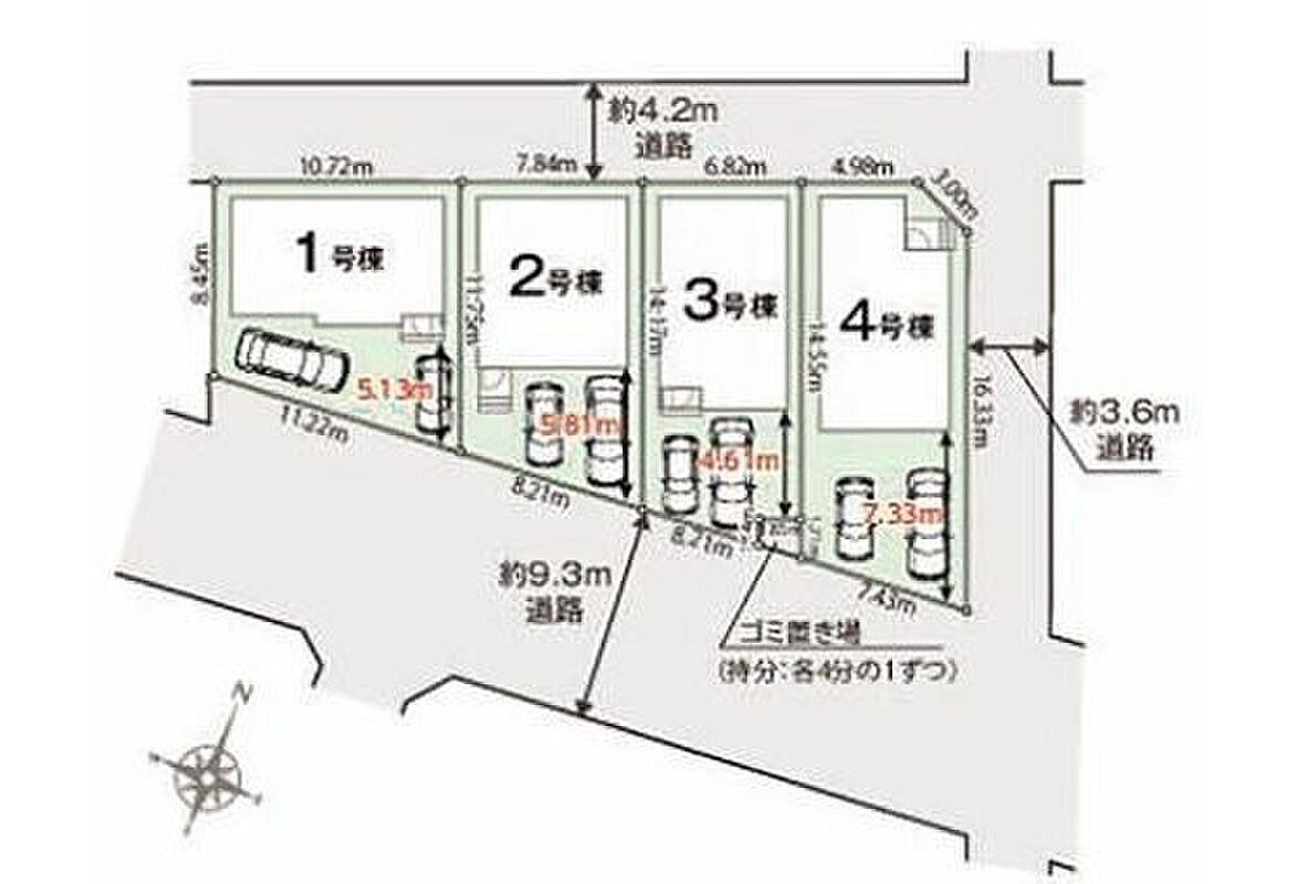 | 駐車場 | 2台 | 道路の幅員 | 道路幅:4.2m~9.3m、アスファルト舗装、二方 : 南 9.32m 公道、北 4.25m 公道他 |