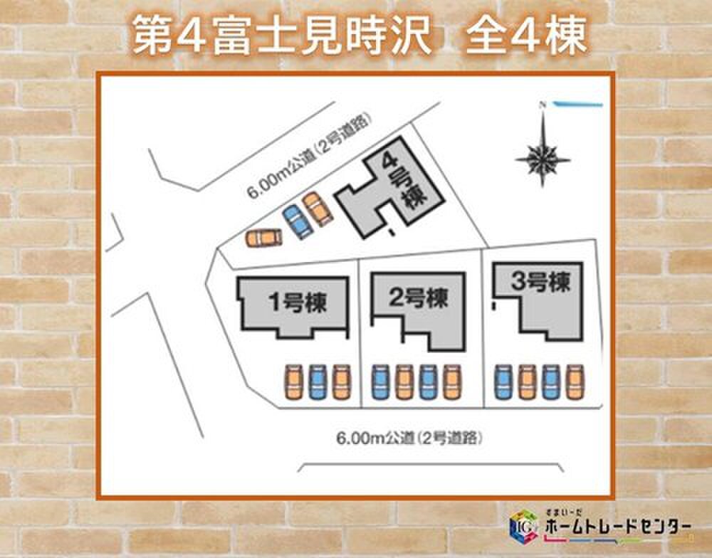 | 駐車場 | 3台 ~ 4台(1・4号棟(3台)、2・3号棟(4台)) | 道路の幅員 | 道路幅:6m、アスファルト舗装、南西側6.00m公道、北西側6.00m公道 |
