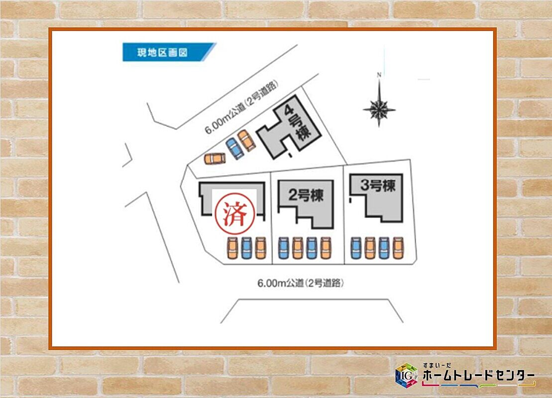| 駐車場 | 3台 ~ 4台(1・4号棟(3台)、2・3号棟(4台)) | 道路の幅員 | 道路幅:6m、アスファルト舗装、南西側6.00m公道、北西側6.00m公道 |