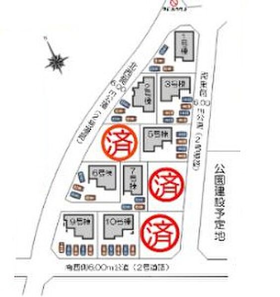 | 駐車場 | 3台 ~ 6台 | 道路の幅員 | 道路幅:6m、アスファルト舗装、北西側6.0m公道、南東側6.0m公道、南西側6.0m公道 |
