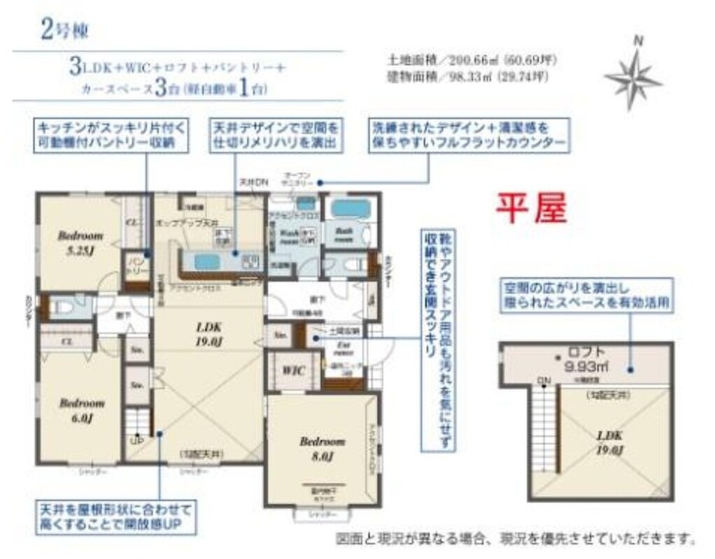 | 建物面積 | 98.33m2・108.37m2(29.74坪・32.78坪) | 土地面積 | 200.66m2・200.68m2(60.69坪・60.70坪) |