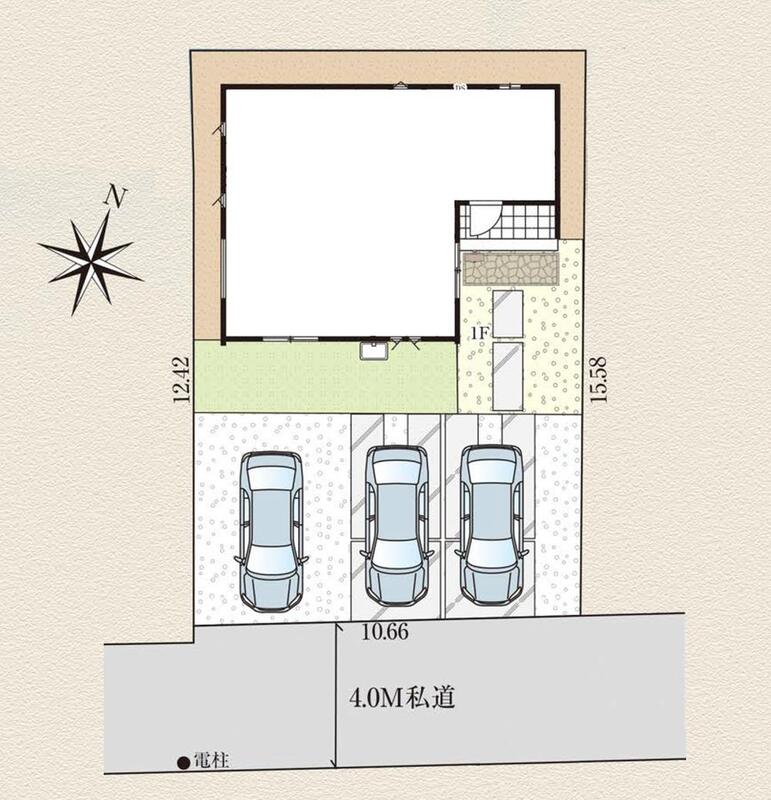 | 駐車場 | 3台 | 道路の幅員 | 道路幅:4m、アスファルト舗装、南側約4.0m私道 |