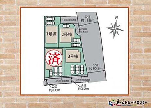 | 駐車場 | 2台 ~ 3台(1号棟:2台・2~3号棟:3台) | 道路の幅員 | 道路幅:3.2m~11.8m、アスファルト舗装、東10.5m~11.8m・南3.2m~3.6m公道 |