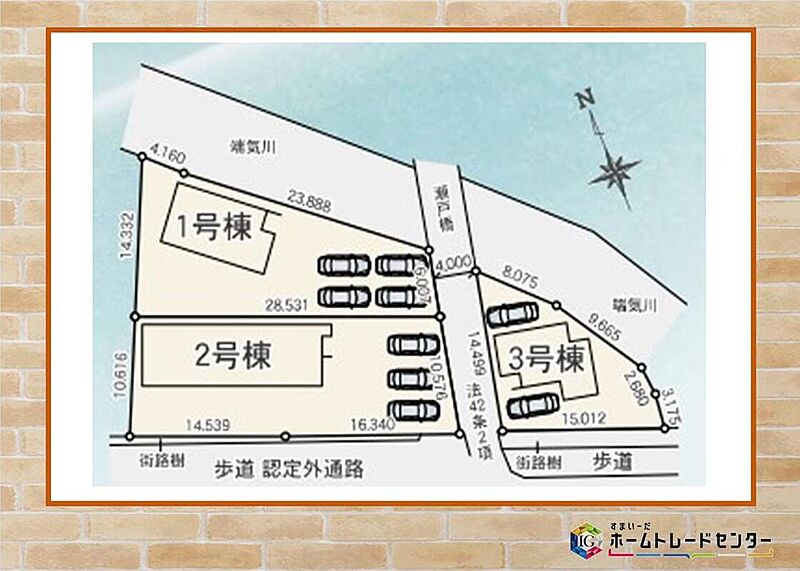 | 駐車場 | 2台 ~ 4台(4台(1号棟)・3台(2号棟)・2台(3号棟)) | 道路の幅員 | 道路幅:4m、アスファルト舗装、東側約4.0m市道 |