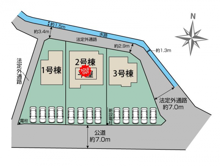 | 駐車場 | 5台 | 道路の幅員 | 南7.0m公道、東3.0~7.0m法定外、北2.9~3.4m法定外 |