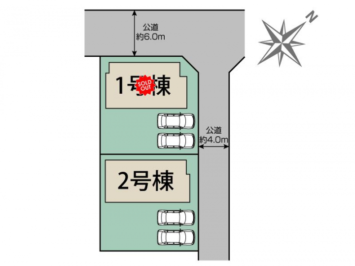 | 駐車場 | 2台 | 道路の幅員 | 北西6.0m公道、南東4.0m公道 |