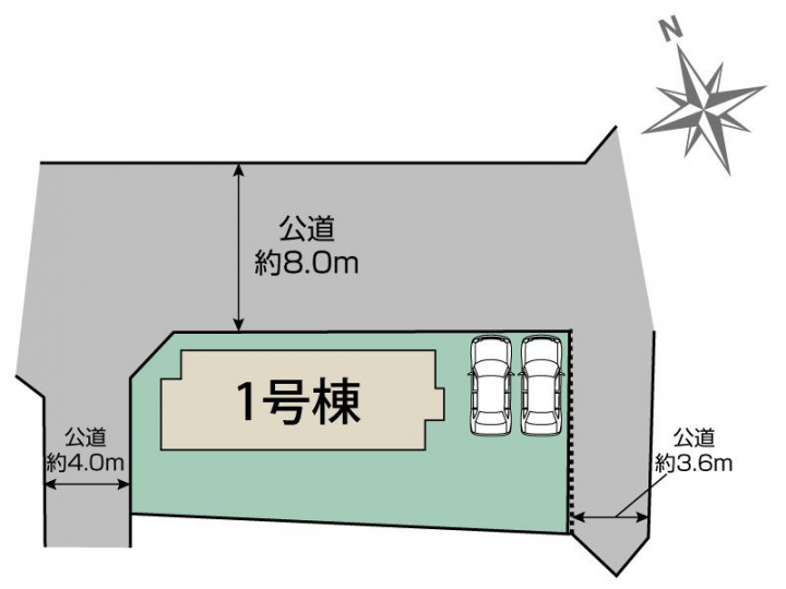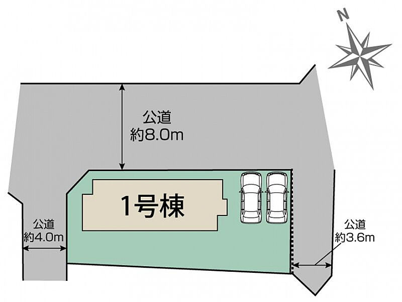 | 駐車場 | 2台 | 道路の幅員 | 東3.6m公道、西4.0m公道、北8.0m公道 |