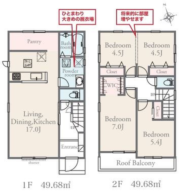 1号棟は将来的にお部屋を増やせる「間仕切り対応」可能な間取りです♪マックスバリューやドラッグストアが徒歩6~10分と毎日のお買い物も便利な立地です。是非ご内覧いただき新生活をイメージください