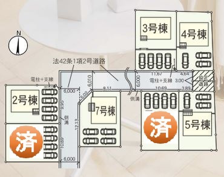 | 駐車場 | 3台 ~ 4台 | 道路の幅員 | 東側6m(1.2号棟) 南側6m(3.4号棟)北側6m(5.6号棟) 西・北側6m(7号棟) |