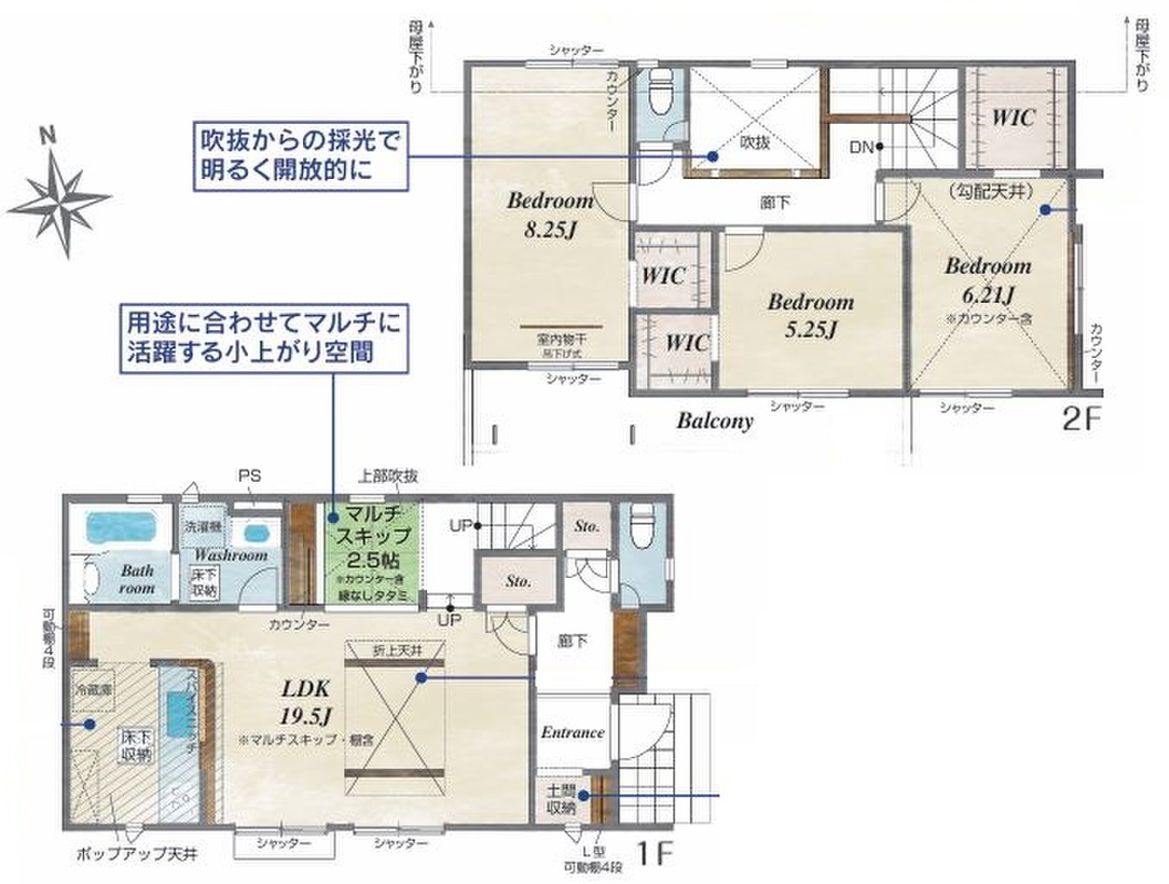- ご好評につき最終の2号棟となりました。リビング横にマルチスキップを備えた3LDKの間取りです。頭上は吹き抜けで明るく開放感あふれる室内です!豊富な収納スペース、充実の設備も魅力です♪