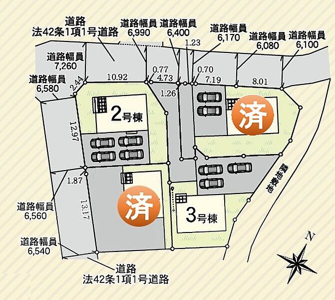 | 駐車場 | 2台 ~ 6台 | 道路の幅員 | 北側6.8~7.2m 西側6.5m |