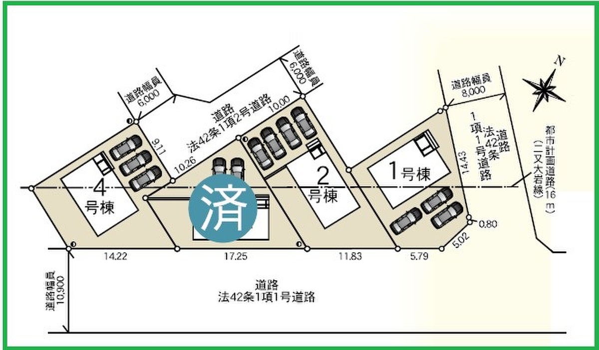 | 駐車場 | 3台 ~ 4台 | 道路の幅員 | 南側10.9m(全棟) 北東側8m(1号棟)北西側6m(2・4号棟) |