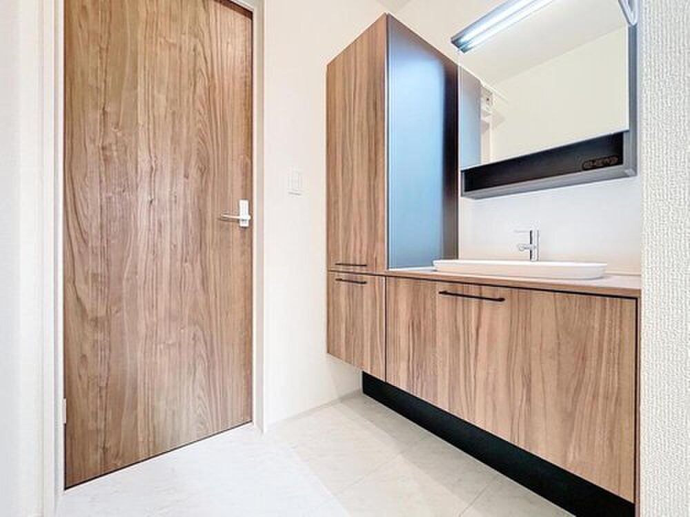 木目調×白のオシャレな洗面台。身だしなみを整えやすい事はもちろんですが、収納スペースも豊富。綺麗すっきり朝のスタートがきれます!