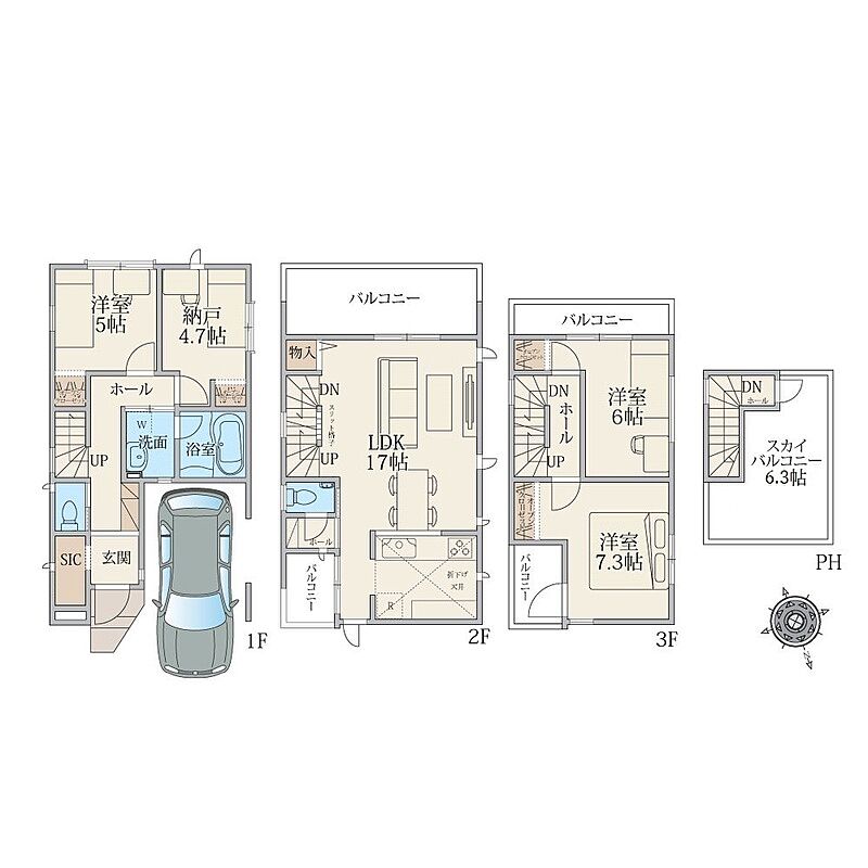 ビルトインカースペースは大切な愛車を雨風から守れますね。風通しと陽当り良好なスカイバルコニーでは、広々とした空間でBBQや日光浴、星空を眺めることができます。