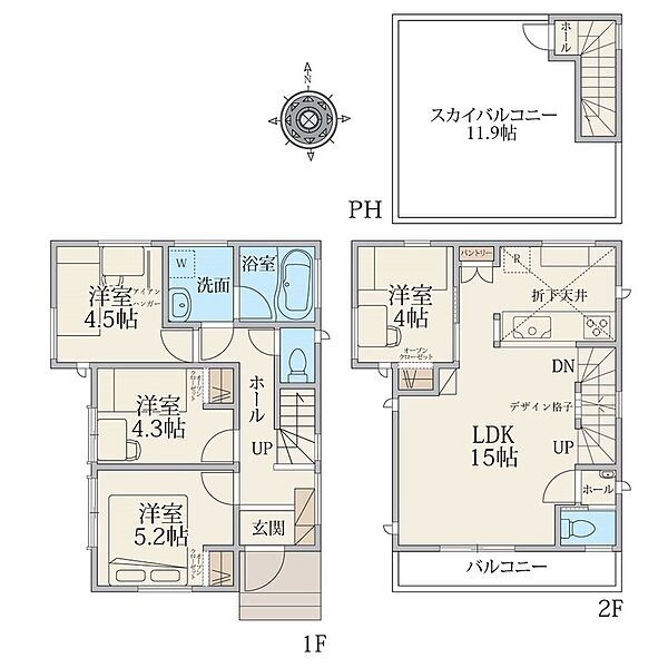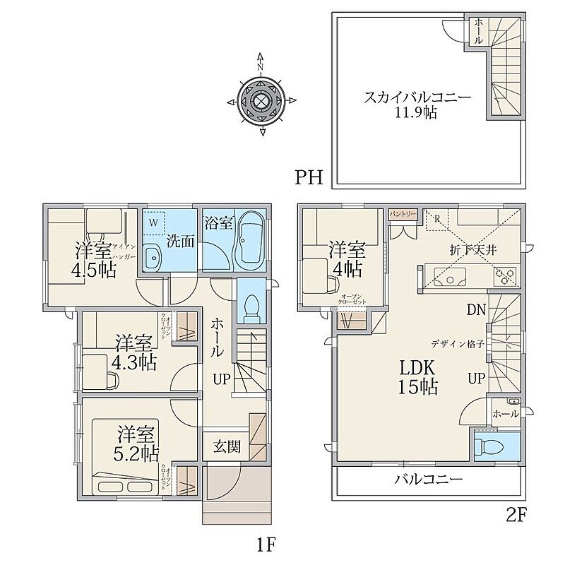 2階LDKは光が差し込む明るい空間!屋上庭園のある天空の家。暮らしにプラスαの贅沢をもたらす特別なスカイバルコニー。収納豊富な間取り!パントリーは食品や日用品ストックに最適です!