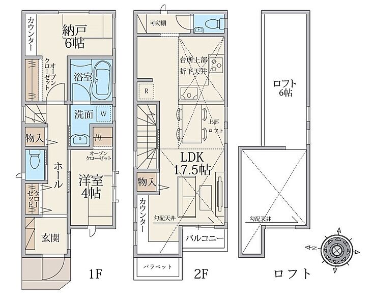 緑豊かな住環境に天空の家登場!まるで秘密基地のロフト6帖付き!全居室収納完備。ボリュームのある収納スペースで快適な生活を!プライバシーを守れる2階LDK!一部勾配天井で開放感あり!
