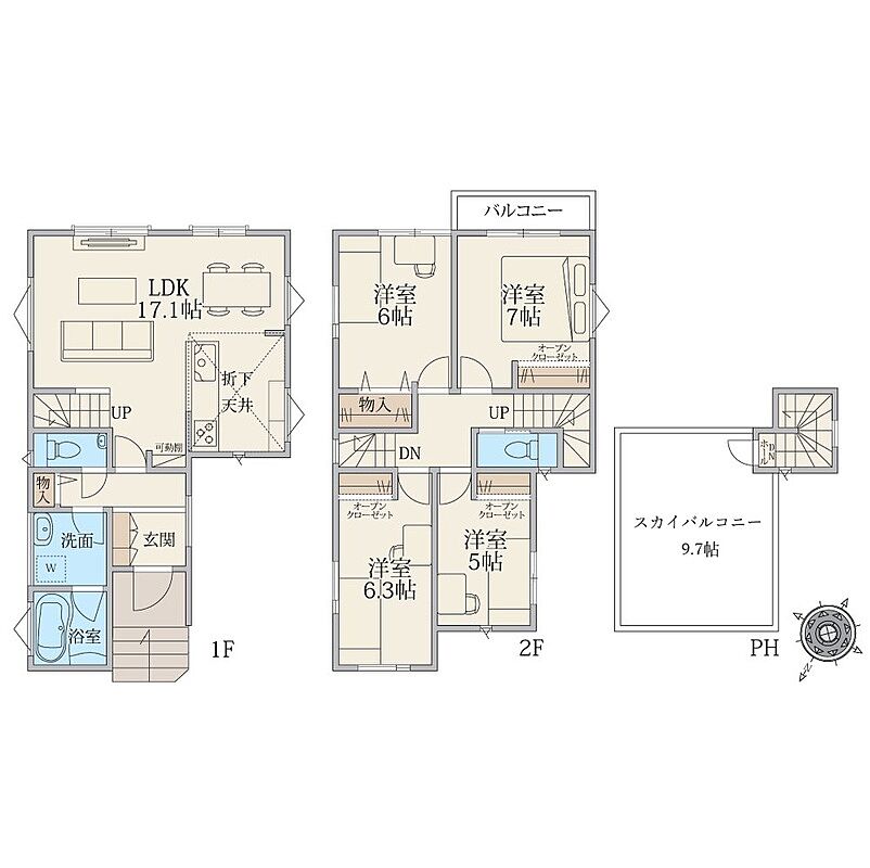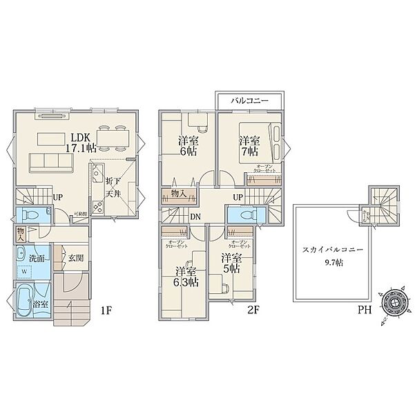 天空の家!屋上スカイバルコニーで暮らしをもっと自由に快適に。全居室5帖以上のゆとりでレイアウト自由自在。全室収納あり!2階はプライベートを楽しむ4部屋の間取り。子供部屋も確保!