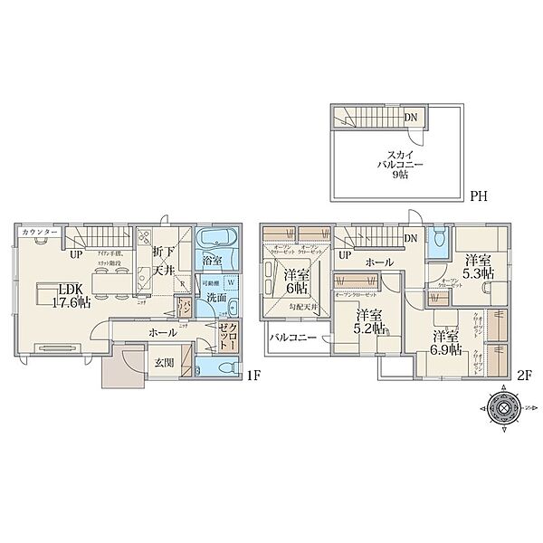 全室5帖以上のゆとり。天空の家で豊かな暮らしを実現できます!キッチンにパントリーがあり、キッチンがスッキリと片付きますね。