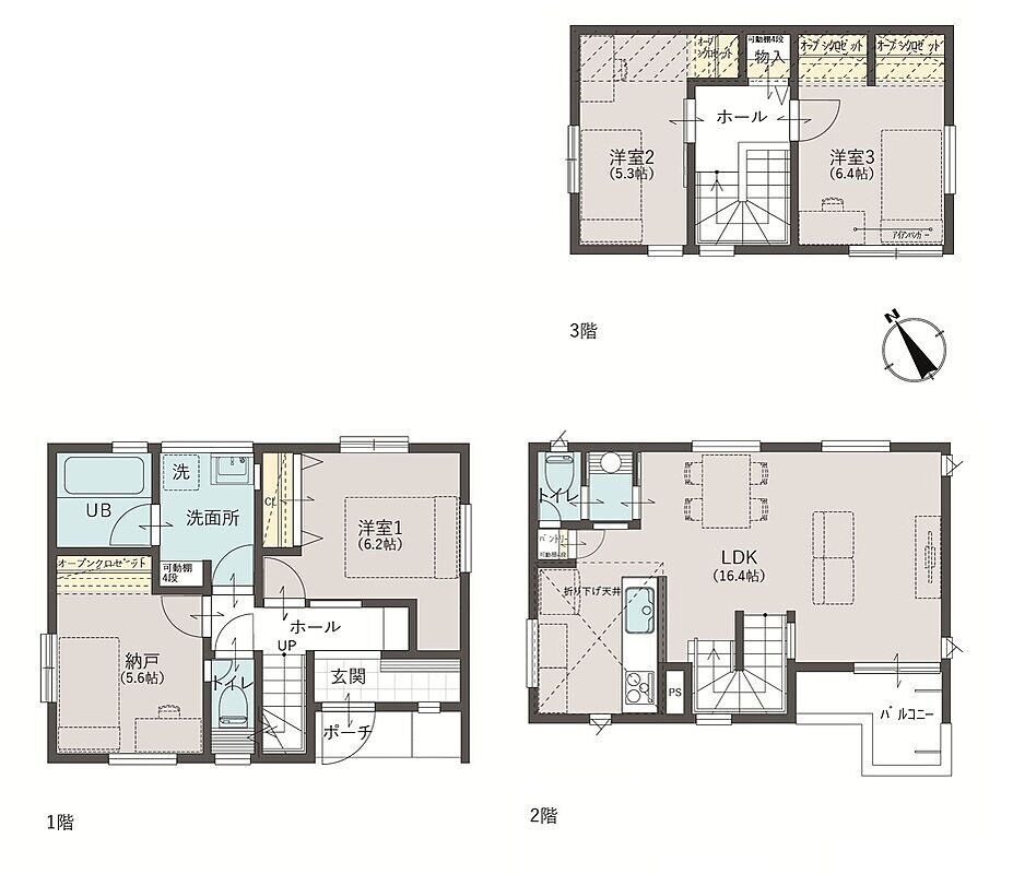 2階リビングにつき、外からのプライバシーを確保できます!LDKは広々16.4帖!納戸や各居室に収納を完備しております。