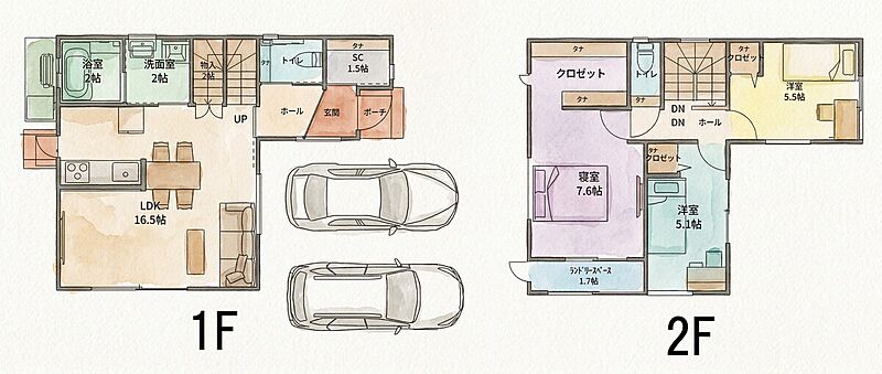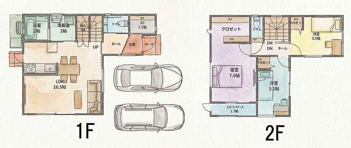 ■キッチン横にテーブルを置き、配膳楽々です ■2Fにはランドリースペースを設け雨の日でも室内干し可能です ■主寝室には大容量のWICがあり収納には困りません ■駐車場は並列で2台駐車可能です