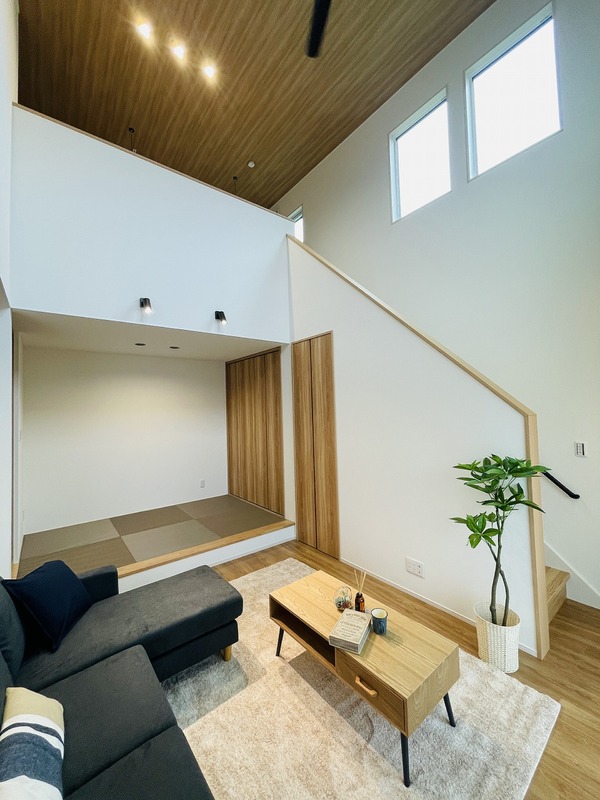 魅力1 リビング上部の吹抜けからはたっぷりと光が差しこむ、和の趣を感じる心地よいリビング