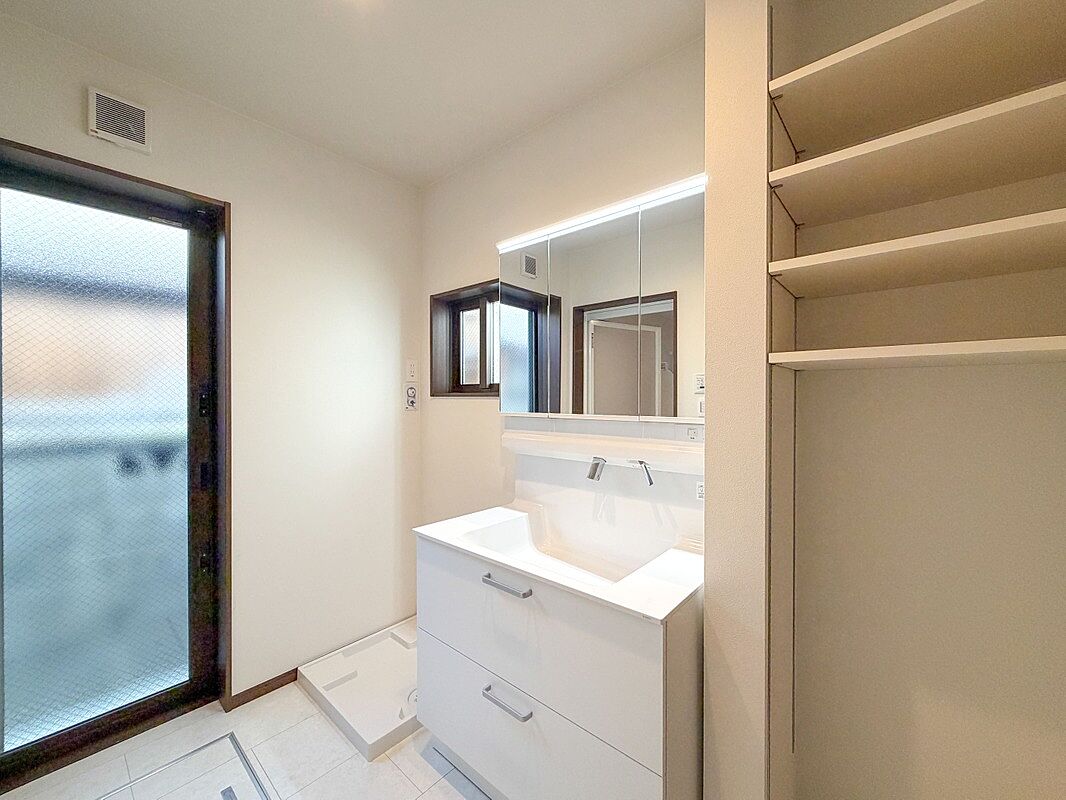・洗面室はゆとりを持たせ収納スペースも完備