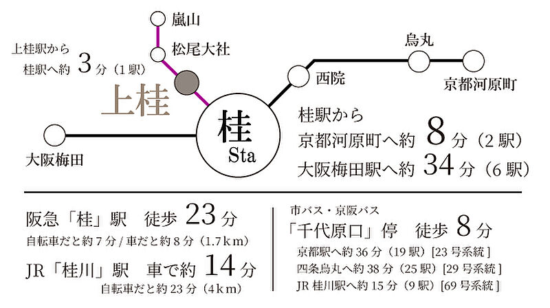 阪急嵐山線「上桂」駅 徒歩16分 阪急京都本線「桂」駅 徒歩22分 バス 徒歩8分 市バス「千代原口」停 |
