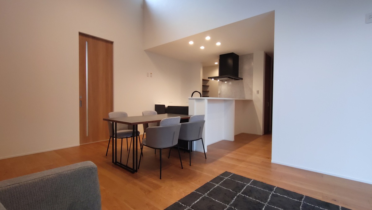 【14号地】光を抑えた玄関の先には開放感のLDK空間。「集う家」の名の通り、自然と家族が顔を合わせ、家事とくつろぎの動線を分けた間取り。風の通り道(重力換気)を計算した心地よい住まいです。