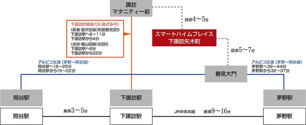 JR中央本線「下諏訪」駅 徒歩13分 「諏訪マタニティー前」バス停 徒歩4分 |
