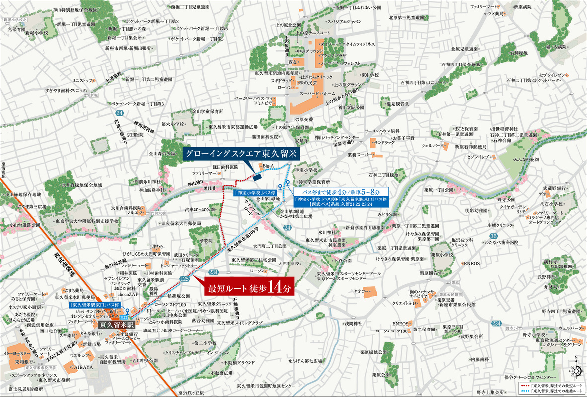 西武池袋線「東久留米」駅 徒歩14分 西武池袋線「東久留米」駅 「神宝小学校」停留所より5分 徒歩4分 西武池袋線「ひばりヶ丘」駅 徒歩28分 |